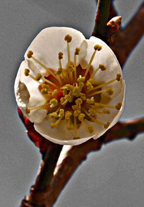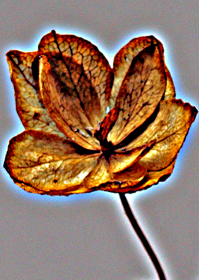 ガクアジサイは西洋アジサイとは違い、額縁のように周りの花弁だけが開く。梅雨時に紫に輝いていたこの花弁も今はこの通りのドライフラワー。