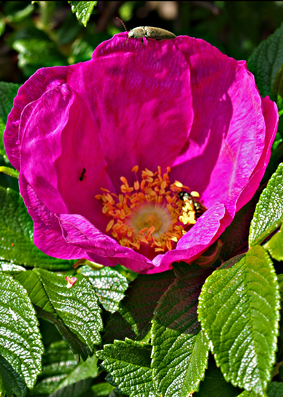 この写真は昨年、7月に撮影したもの。2004年に北海道へ初めて行った時に持ち帰った種が発芽し、毎年、鮮やかな色で咲く。近寄り過ぎると棘が刺さる。バラ科の難。