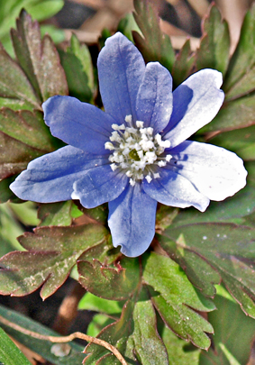 カタクリに先立ち、広葉樹林の芽吹きの前に、穏やかな光を浴びて咲いている。菊に似ているので菊咲の名。