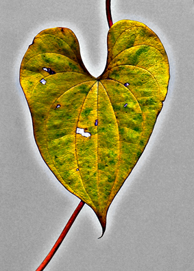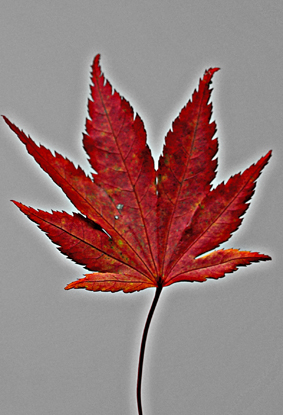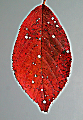 紅葉のヒナタイノコヅチ。すっかり力がなくなり、真下にぶら下がっている。真紅の葉に緑の葉脈の対比が美しい。刻まれたしわも見事。