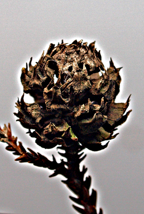 杉はとても馴染みがある木だ。真直ぐの木「直木(すぐき)」からと、上に進む木「進木(すすぎ)」からの説があるらしい。どちらにしても直線的なイメージは木の形からだ。写真は雌花。雄花が花粉を飛ばす。