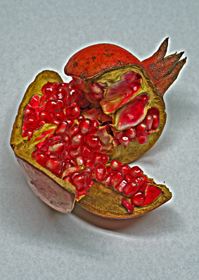種子が多いので、多産と豊穣の象徴。そして、ザクロは人肉の味に似ていると聞いた。釈迦が人食いの鬼神にザクロを与え、人を襲わないと約束させたことかららしい。確かに、血の色だ。